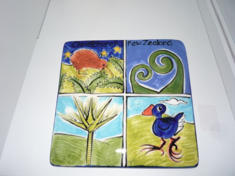 Christchurch New Zealand Scene hanging tile, Hand Painted. Kiwi, Koru, Nikau Palm, Pukeko. 14cm squared.This tile says Christchurch New Zealand on it, but you could put New Zealand on, or anything else you like.