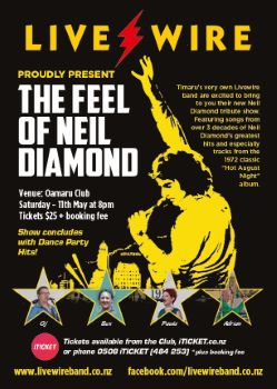 Just a friendly reminder to get your tickets for the Livewire/Neil Diamond Show at the bar for this Saturday night. We know that many people have talked about coming along, and were probably going to get a ticket at the door, however if we don't get more tickets sold by Friday morning, there is a chance the show won't go ahead. Come on in and get your tickets at the bar today - only $25.