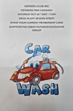 CAR WASH: We have a car wash available for financial members this Saturday 25th October for 9-11am, please present your card to have your car washed. Oamaru Club supporting WBHS Outdoor Education Group